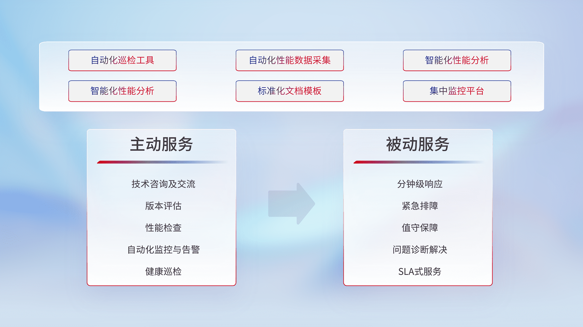 智能化工具和标准化文档,,保障服务质量,,,,提供主动服务(包含技术咨询、、、版本评估、、、、性能检查、、自动化监控与告警、、、、健康巡检)和被动服务包含(分钟级响应、、、紧急排障、、、值守保障、、、、问题诊断解决、、SLA服务)。。。。